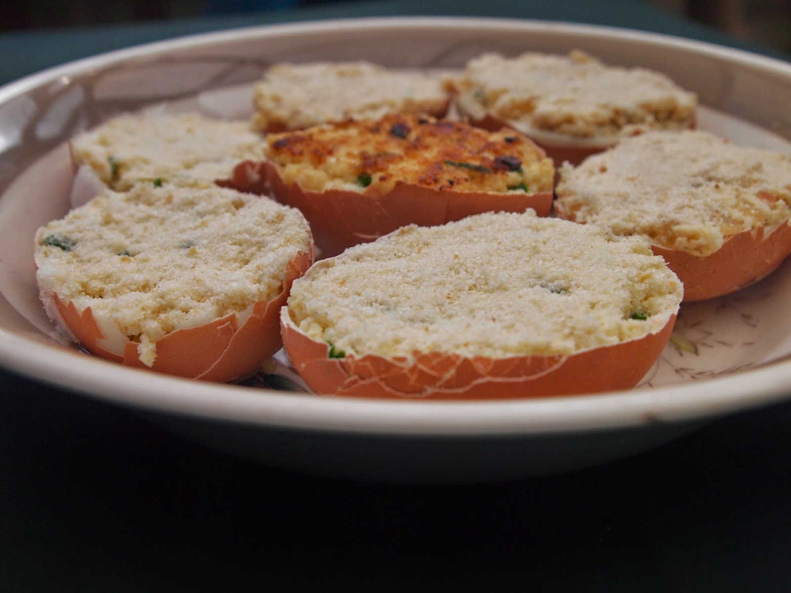 Żółtko z białkiem siekamy\miksujemy\przeciskamy przez praskę, następnie mieszamy z wybranymi dodatkami i doprawiamy. Gotowym farszem wypełniamy skorupki, ubijając masę, by napchać najwięcej jak się da. Następnie posypujemy bułką tartą.